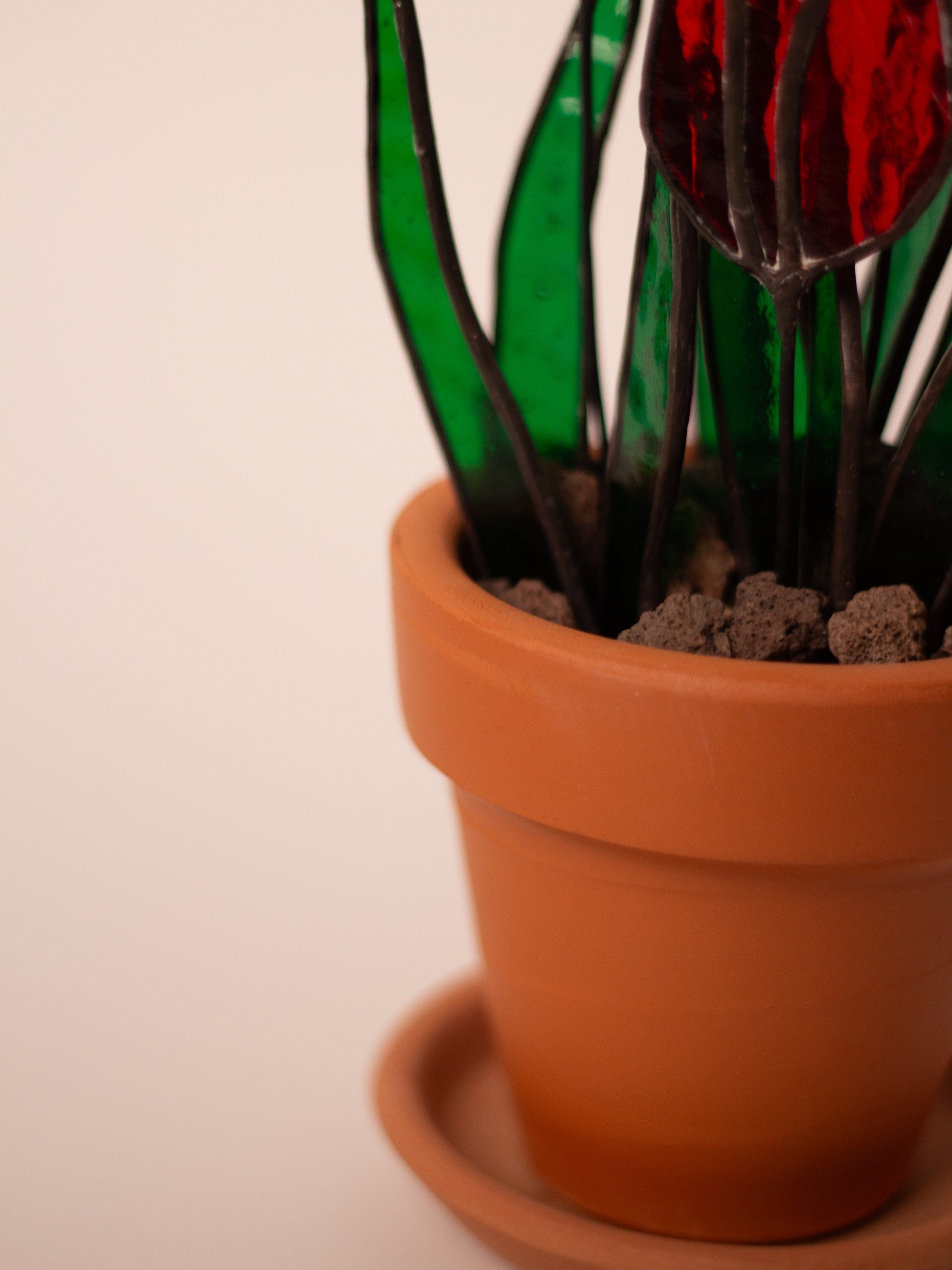 El işçiliğiyle camdan kesilip lehimlenen bu özel vitray çiçek, terracotta saksı ve tabağıyla birlikte gönderilir.